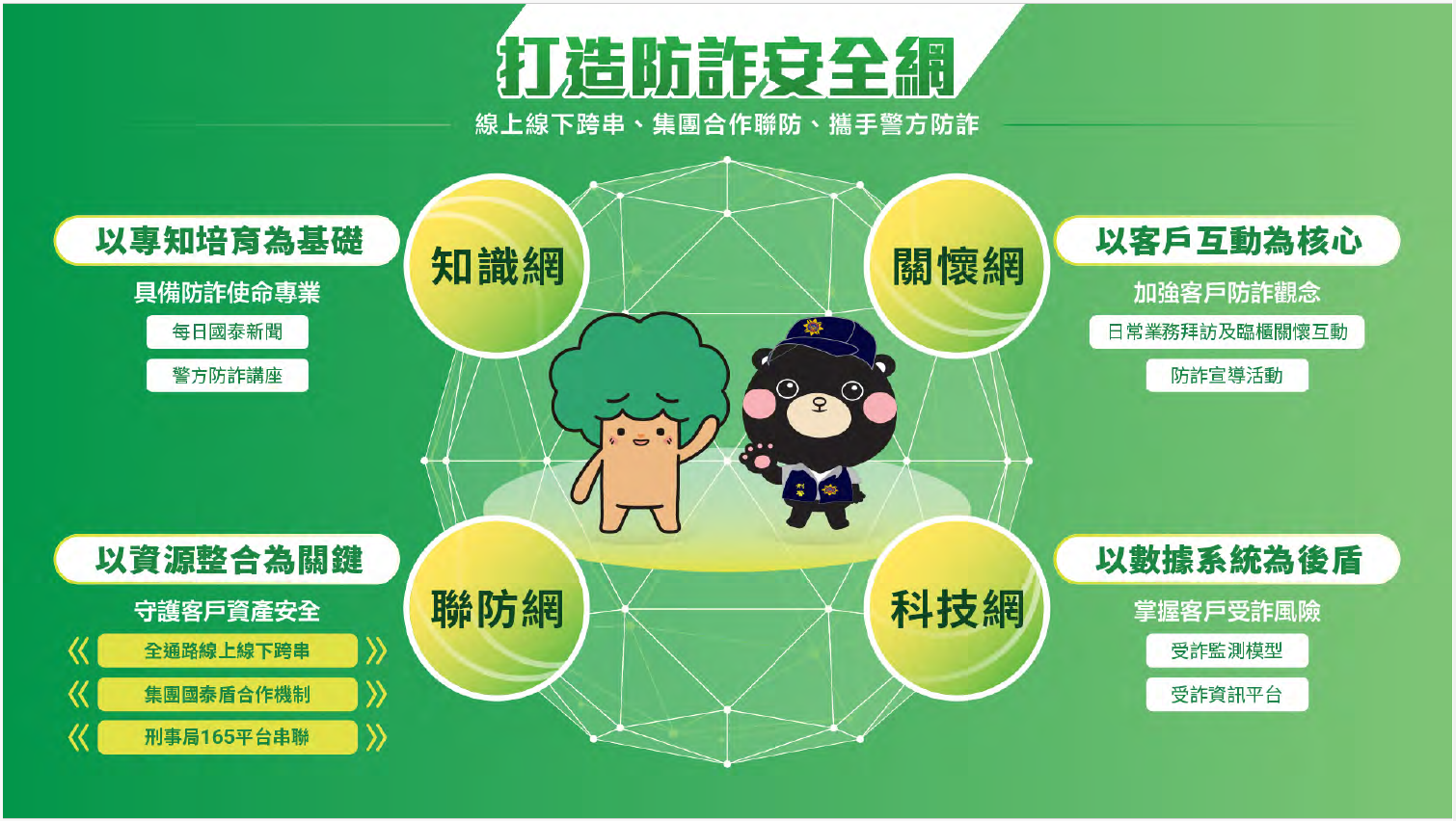 國泰人壽與警政署刑事警察局共同宣布,正式啟動「防詐安全網」行動,從「知識網、科技網、聯防網、關懷網」四大防護面向,將識詐教育推廣至全齡民眾,全面阻詐守護國人財產安全。