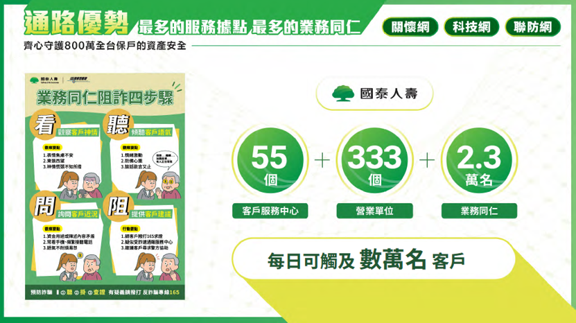 服務據點的客服同仁,以及主動服務的業務同仁,落實「看、聽、問、阻」四大要點,主動關懷客戶,成為阻斷詐騙的第一道防線。