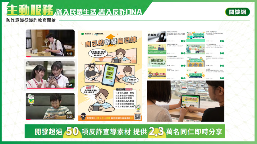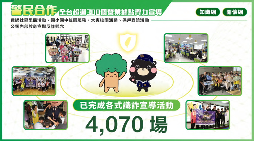 結合警民合作,透過社區里民活動、國小國中校園服務、大專校園活動、保戶聯誼活動,以及公司內部的宣導活動,推動識詐教育,讓防詐工作發揮最大效益。