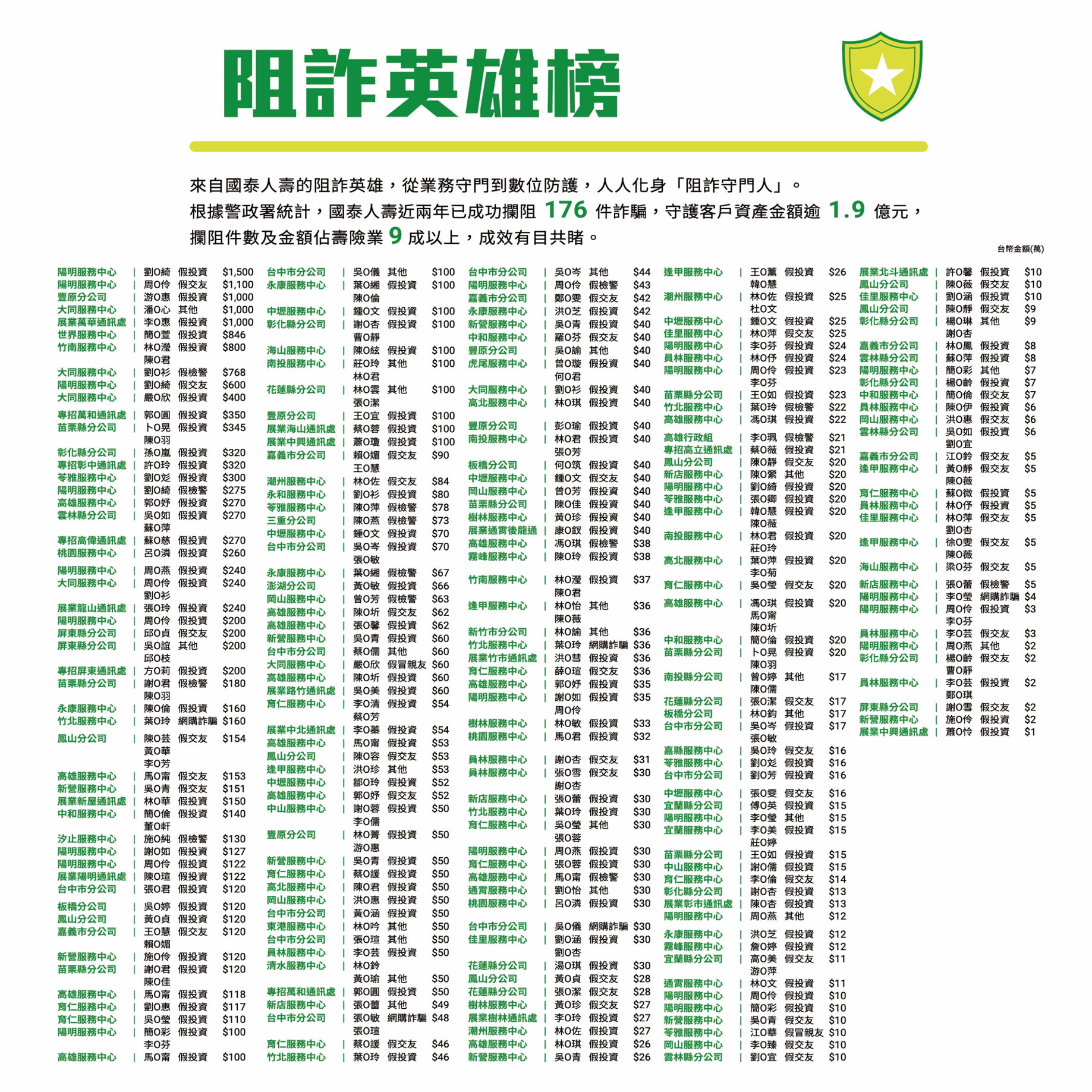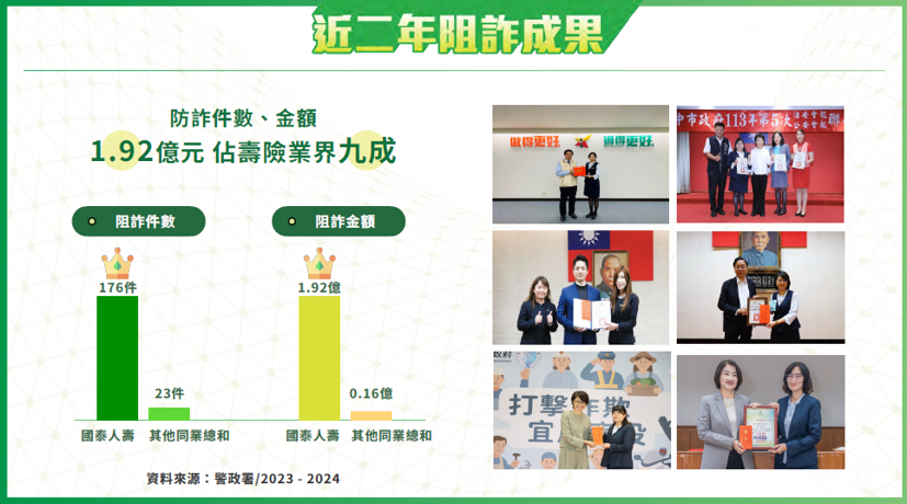 國泰人壽與警政署刑事警察局合作多年成效卓越,近兩年成功攔阻176件詐騙案件、守護民眾資產1.92億元,阻詐金額占整體壽險業界九成,成果居保險業第一。