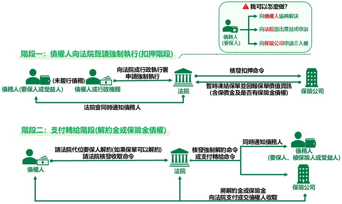 債權人針對(1)債務人為要保人或(2)債務人為受益人的保險契約申請強制執行後,執行機關將會依債權人的申請核發扣押命令,『禁止』債務人對保險契約為下列行為: 一、收取保險契約債權:包括債務人基於保險契約之要保人、被保險人或受益人等身份得領取之債權,如保單價值準備金、保險給付、解約金、紅利及其他依保險契約所得領取之各項金錢。 二、其他處分:包括變更要保人、指定或變更受益人、實行保單借款及其他讓與或設定負擔等行為。 執行機關核發扣押命令並確認已扣押保險契約後,如果債務人是要保人,執行機關會通知債務人,限期債務人就執行機關「擬代位要保人終止其所投保之保險契約」表示意見,如果債務人未表示意見或聲明異議,執行機關後續會核發執行命令,以解約金或保險金債權清償債務。