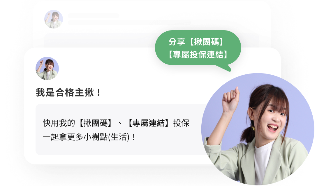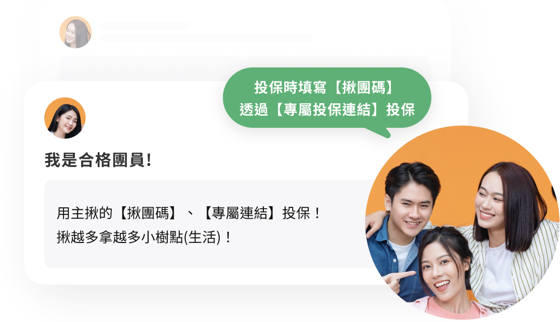 投保時自動獲得一組【揪團碼】和【專屬投保連結】,